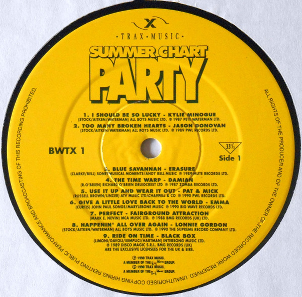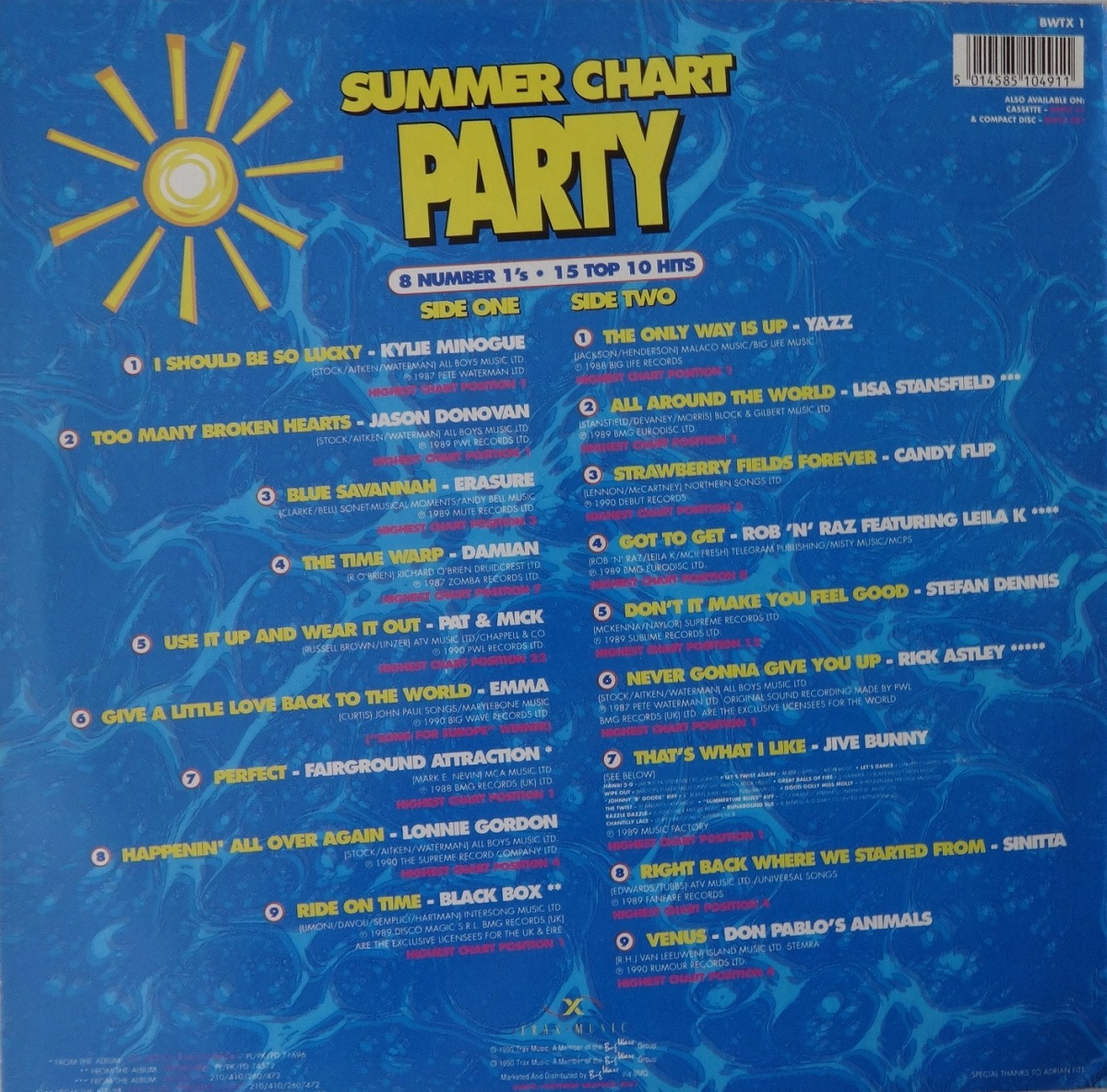 A cursory glance at both the cover and the tracklisting makes it all too wince-inducingly obvious that the compilers – and indeed the designers – of Summer Chart Party were shamelessly attempting to emulate the Hit Factory compilations, those million-selling late eighties collections of recent Stock Aitken Waterman-affiliated hits with the odd rare 12″ extended version and little-known ‘big across Europe’ curio thrown in for added interest. As such, we get a substantial line-up of PWL-friendly artists; Kylie Minogue, Jason Donovan, Pat & Mick, Rick Astley, Lonnie Gordon, Sinitta and, er, Damian – mostly with tried and tested hits from a year or two previously so that listeners mercifully get I Should Be So Lucky and Too Many Broken Hearts instead of Hang On To Your Love – alongside contemporaneous Smash Hits-friendly fodder from Yazz, Lisa Stansfield, Stefan Dennis and long-forgotten Eurovision hopeful ‘Emma’. Oh and Jive Bastard Bunny, but we’ll come back to them in a moment. Anyway, all of this would appear on face value to chime neatly with the prevailing What-Time’s-Neighbours-On? mindset of the times, but trying to copy The Hit Factory on a compilation that proudly proclaimed itself to be ‘The Sound Of Summer 1990’ was a non-starter on two counts. Firstly, whether they had admitted it to themselves yet or not, Stock Aitken And Waterman’s popularity was most definitely on the wane by the summer of 1990, and most of their earlier hits had been sold and resold to punters a million times over already, not least on the Hit Factory compilations themselves. Secondly, and more significantly, it was an album that smacked of the eighties at the dawn of a new decade that just couldn’t wait to leave the eighties behind.