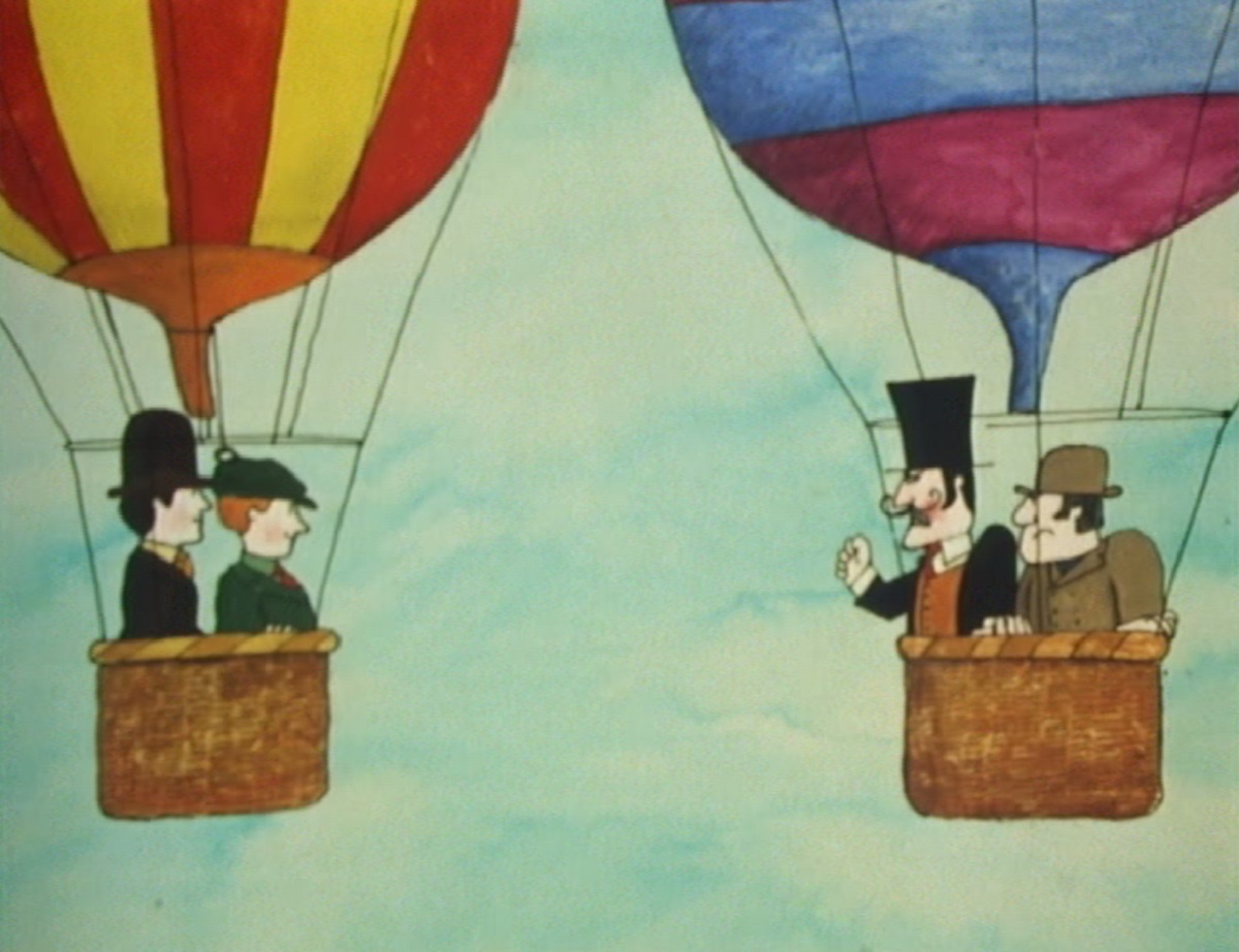 A huge crowd of people in Quality Street-style getup resembling a lost scene from The Wrong Box have assembled to watch the competitors set off, and while surveying the proto-Howard Stark technological whizzbangery that they’ve all affixed to their balloons in the hope of gaining an advantage, Mr. Benn notices that one of the balloons is occupied by a lone individual apparently cosplaying as someone from Peaky Blinders. ‘The Young Man’ – that’s all that he’s ever introduced to us as – laments to Mr. Benn that his co-pilot ‘suddenly had to go’. This he attributes to the machinations of one Baron Bartram, a top-hatted twirly-moustached toff who will apparently go to any lengths to ensure that he wins a balloon race; an enviable skill but one that you can’t help but suspect wasn’t exactly pressed into service that often. Anyway, seeing as he is already dressed for the part, Mr. Benn volunteers his services as a co-pilot despite apparently having no obvious previous experience of or expertise in the artform. Which can perhaps be used as evidence to convince certain individuals who have loudly declaimed that we have all ‘had enough of experts’ that they too should embark upon a balloon flight in exact identical circumstances.