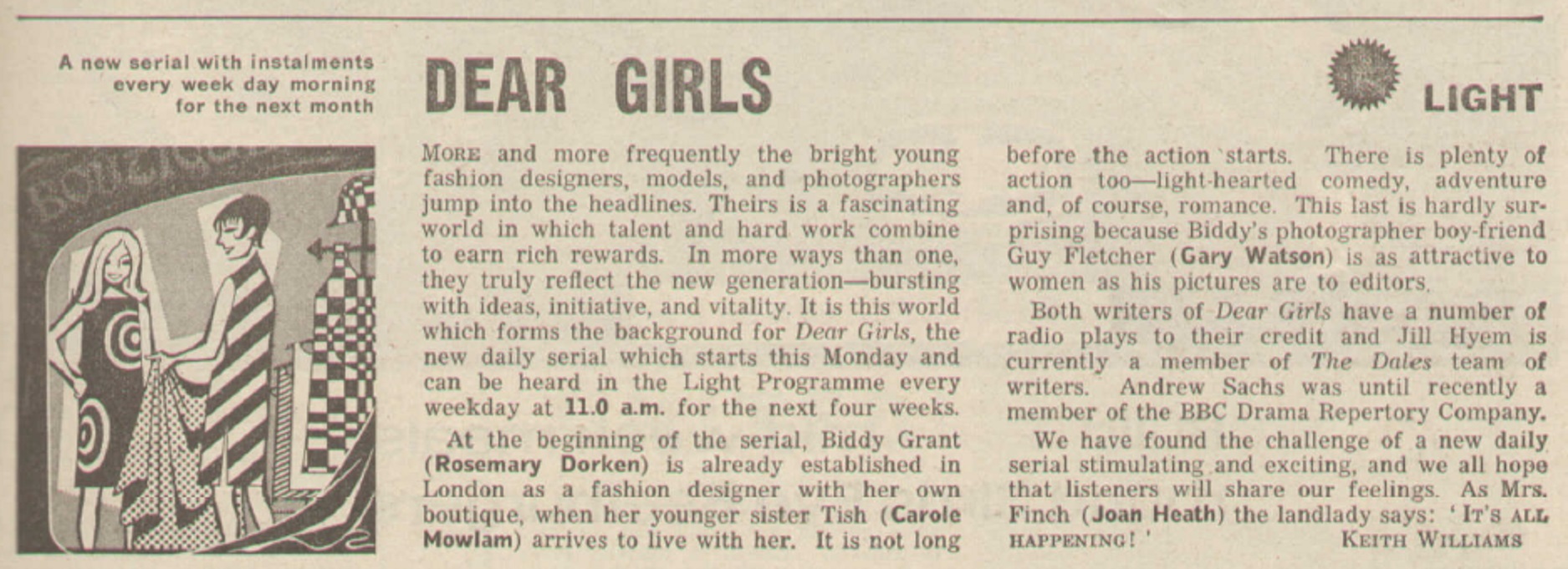 Over on the Home Service, there’s an alarming battery of short individual news shows – amongst them Outlook, Today’s Papers, From Our Own Correspondent, a confusing repeat of Friday’s Ten To Eight as Ten To Seven, Farming Today and On Your Farm, Sounds Topical, The Weekly World and In Your Garden, presented by one ‘Roy Hay’ – where you would now just get a single over-arching magazine show. There are a fair few religious shows – indeed, several of the news shorts were disconcertingly billed as having a ‘Christian slant’, as if one was needed on gas being struck in the North Sea – and some educational broadcasts which must have had the poor unfortunates forced to listen to them on a Saturday morning wishing that the wireless had never been invented. Matters pick up sharply with a repeat of the 30th May 1965 edition of Round The Horne – featuring Kenneth Horne: Special Agent in ‘The Eiffel Tower Is Stolen’, a visit to Julian And Sandy at Bona Pets, and Rambling Sid Rumpo treating us to The Cornish Lummock Woggling Song – and the previous Monday’s Desert Island Discs with castaway Rita Tushingham. Her wide-ranging choices included Sibelius, Peggy Lee, The Modern Jazz Quartet and as was apparently law in the mid-sixties The Beatles, while her luxury was apparently the Albert Memorial. As there is no known surviving recording of this edition, we can only guess at Roy Plomley’s mock-bemused witticisms about the sheer impracticality of this suggestion.