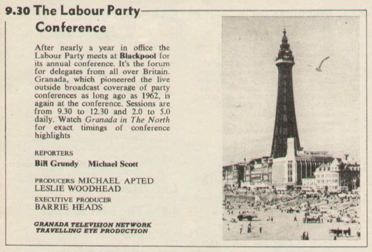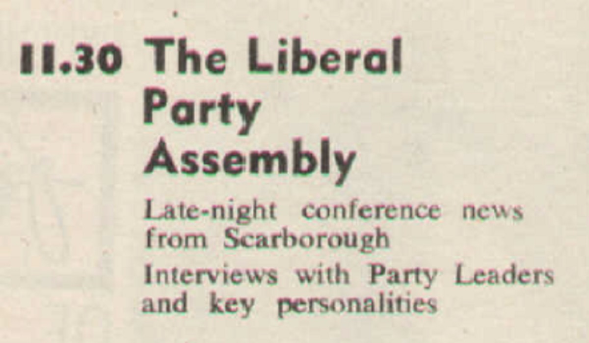 Aside from the time-honoured ‘Saturday Night Western’ – on this occasion Marlene Dietrich vehicle Rancho Notorious – the rest of the evening on BBC1 was taken up by imported entertainment from comic folk singer of ‘Camp Granada’ impenetrableness Allan Sherman, and crooning Bear-asking-for-‘cookies’-botherer Andy Williams, followed by – more intriguingly – mother and daughter Margaret and Julia Lockwood in The Flying Swan, a comedy drama about a hotel owner and her air hostess daughter. Reportedly somewhat on the surreal side, it sounds very much like a series well worth dusting down and revisiting, and as this week’s instalment The Contract – in which Carol finally gets to achieve her longstanding ambition of actually flying a plane – is one of only two known to survive, maybe we might get the chance to do that soon. Oh, was that a hint I dropped just there? Well it pays to be subtle. The evening finishes off with Robin Day, Ian Trethowan and Kenneth Harris reporting from the Liberal Party Assembly, and with everything the way it is right at the moment you’re probably thinking that political television coverage of any sort can fuck the fuck off and that you’re glad that we won’t be dwelling on this. Woah ha ho, just you wait.