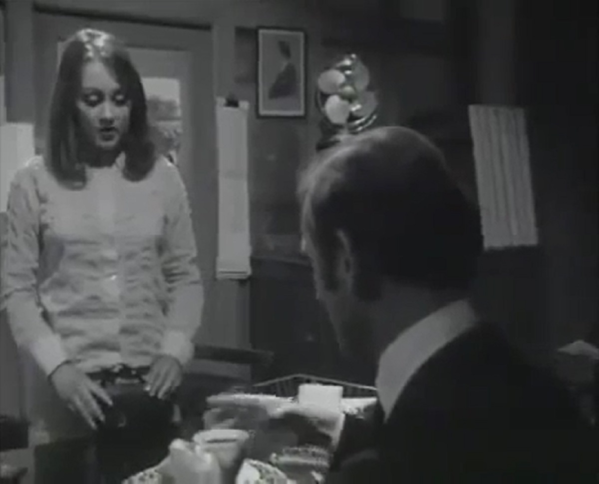It turns out that the popular beat combo in question are ‘The Pink Shape’, and their latest hot disc is issuing from a transistor radio owned by Hadleigh’s secretary Lolly, as played by an extremely young Paula Wilcox. After serving up some instant coffee, which Hadleigh controversially professes to prefer to the genuine article, she begins dancing coyly to said Pink Shape hit parade smash and asks her employer if he would like to come to her birthday party. Hadleigh is surprised and a tad reluctant, causing a clearly quite crush-stricken Lolly to pull a face and mention that her friends had “dared me I wouldn’t invite you”, and could only conclude that she must have just imagined that he liked her. This clumsy attempt at reverse psychology has the desired effect and he agrees to show his face at her auntie’s house at the allotted time, although Lolly’s instructions on how to get there via the 92 bus from outside the Odeon only occasion an exasperated look and an offer of a lift. As Lolly prepares to leave, Hadleigh takes the opportunity to point out that he doesn’t know what her name is actually short for. “Lolita”, she replies with a wink. Ahem.