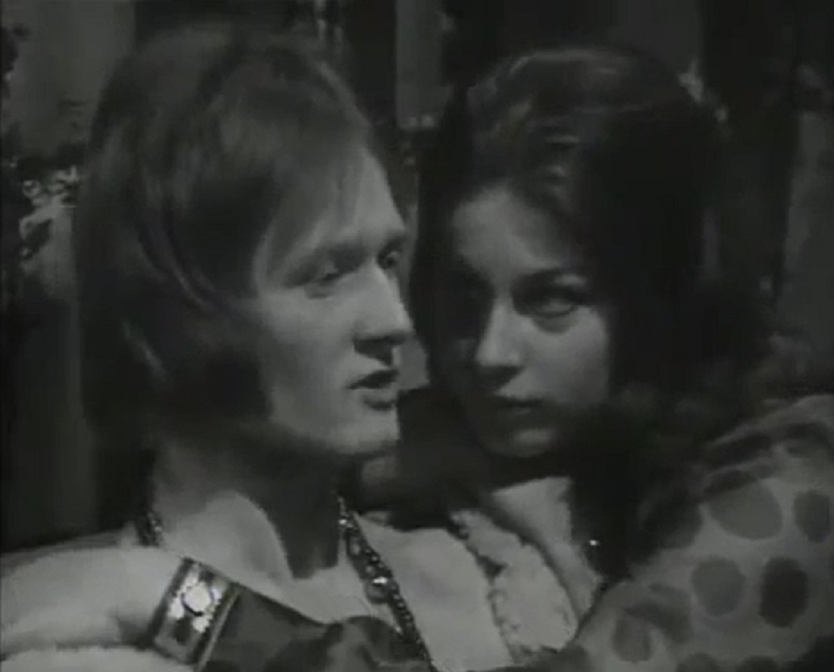 Informing his butler Maxwell that he won’t need a driver tonight as he’ll be sticking to soft drinks – yeah, and the rest – Hadleigh picks up a transistor-toting Lolly in his Rolls Royce, pausing only to ask her if they’re still listening to The Pink Shape – “no, it’s The Idiots” – before pulling up outside a bland semi. Inside, Lolly’s George Layton-resembling zonked-out hippy pals are passing around bits of card and suspiciously thick cigarettes, with a couple of them venturing as far as to sway indeterminately to far-out psychedelic sounds, when a young Christian Rodska approaches Hadleigh to venture some of his Acid-fuelled insight. “He who knows the masculine and yet keeps to the feminine will become a channel drawing all the world towards it, and he who knows the white and yet keeps to the black will become the standard of the world”, apparently. Hadleigh, who in turn offers the wisdom that he has to be up early the next morning, feels decidedly out of place but does partake in a snifter of ‘fire water’. Upon which the record player blasts out what appears to be a showband version of Led Zeppelin, and Lolly briefly persuades Hadleigh to dance before he is again accosted by the pre-Follyfoot prophet in full zen-dispensing flow. “It’s a well-worn scene man, a well-worn scene” – “Yes, you’ve certainly got a point there”.