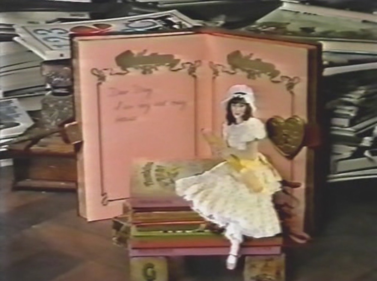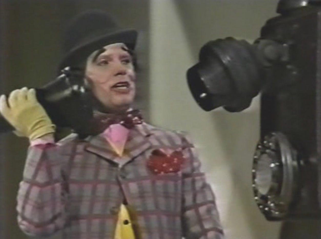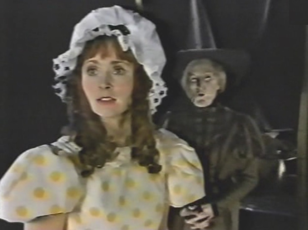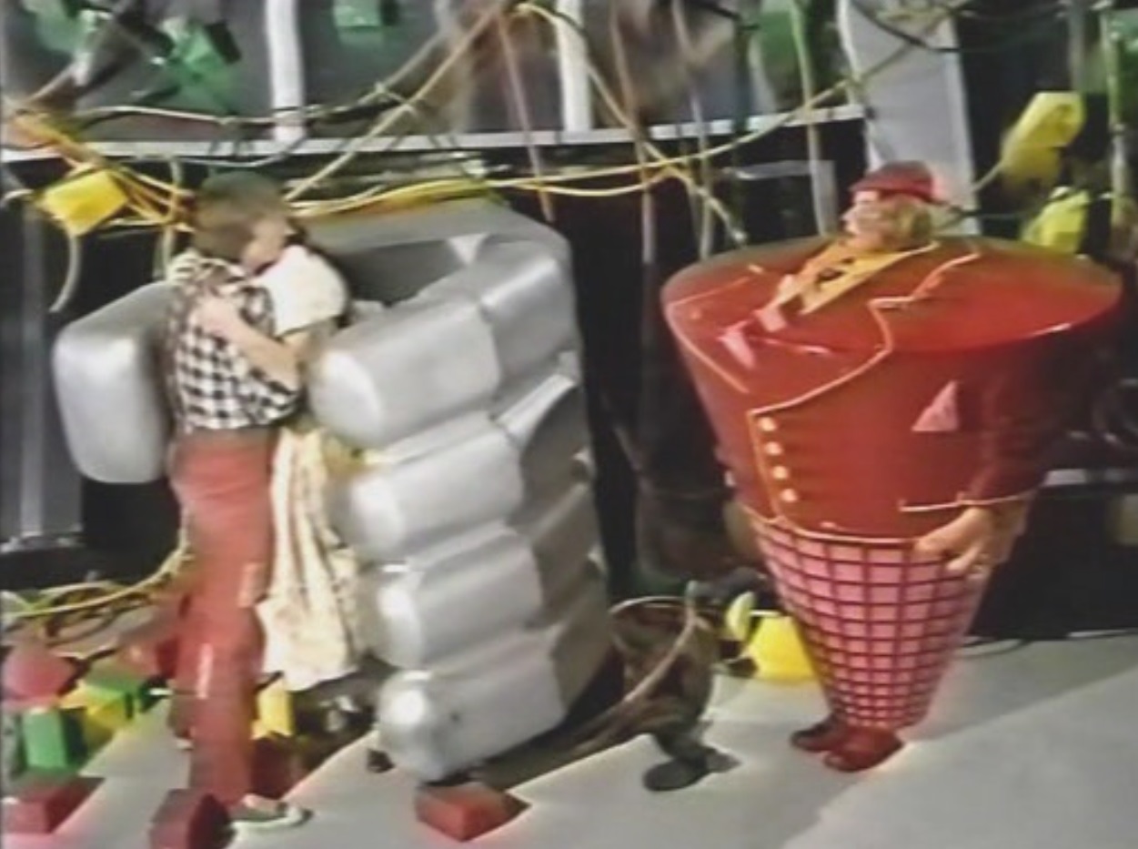 Conn, a Max Miller-infringing ventriloquist’s dummy, is on the oversized blower to The Witch, who is screechily briefing him about how she wants him to deal with the rogue living doll. On spotting Quincy, Conn switches into full Barnum mode and ushers him through a sleazy strip club-style doorway promising both ‘Girls Girls’ and ‘Novelties’, bamboozling him with rapid-fire comedy patter en route; “they don’t call me Conn for nothing!”, he grins sinisterly to the audience. In the auditorium, Quincy takes a seat in front of a Safety Curtain decorated with Victorian lithographs of archaic vaudeville figures and what appears to be Radio 1 DJ Gary Davies; as you might have predicted, Conn then beckons Quincy up on stage to join him in a swaggering number called Have Half Of My Laughter. After a hesitant start, he soon gets into the literal swing of things – suddenly acquiring a duplicate of Conn’s stage outfit in the process – and finishes up dancing wildly with a chorus line of blonde Sindy-style dolls. Needless to say, this sequence outstays its welcome by several thousand millennia and is the exact polar opposite of what any average child viewer would have found entertaining anyway.