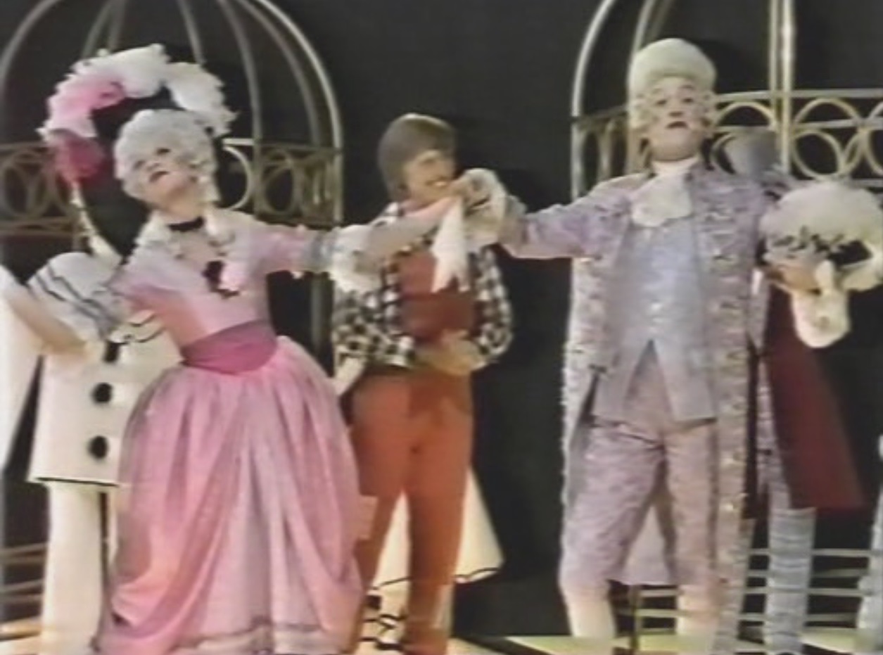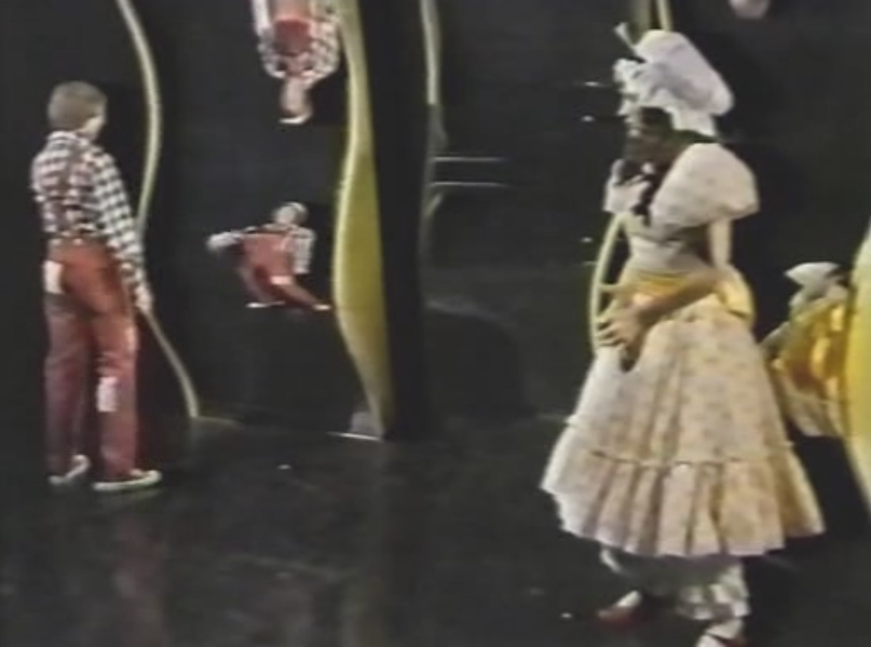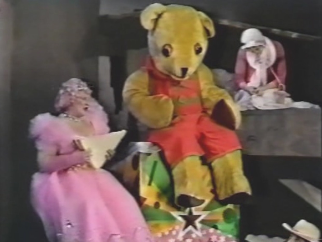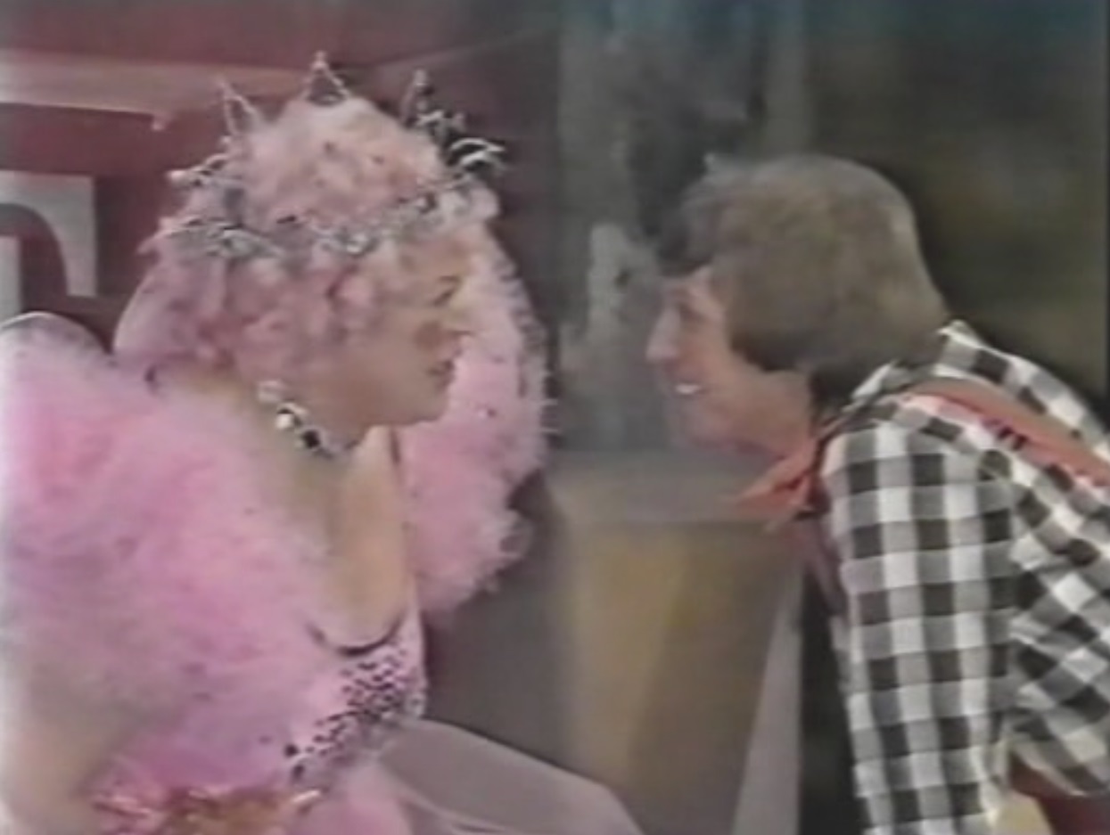 Conn, a Max Miller-infringing ventriloquist’s dummy, is on the oversized blower to The Witch, who is screechily briefing him about how she wants him to deal with the rogue living doll. On spotting Quincy, Conn switches into full Barnum mode and ushers him through a sleazy strip club-style doorway promising both ‘Girls Girls’ and ‘Novelties’, bamboozling him with rapid-fire comedy patter en route; “they don’t call me Conn for nothing!”, he grins sinisterly to the audience. In the auditorium, Quincy takes a seat in front of a Safety Curtain decorated with Victorian lithographs of archaic vaudeville figures and what appears to be Radio 1 DJ Gary Davies; as you might have predicted, Conn then beckons Quincy up on stage to join him in a swaggering number called Have Half Of My Laughter. After a hesitant start, he soon gets into the literal swing of things – suddenly acquiring a duplicate of Conn’s stage outfit in the process – and finishes up dancing wildly with a chorus line of blonde Sindy-style dolls. Needless to say, this sequence outstays its welcome by several thousand millennia and is the exact polar opposite of what any average child viewer would have found entertaining anyway.