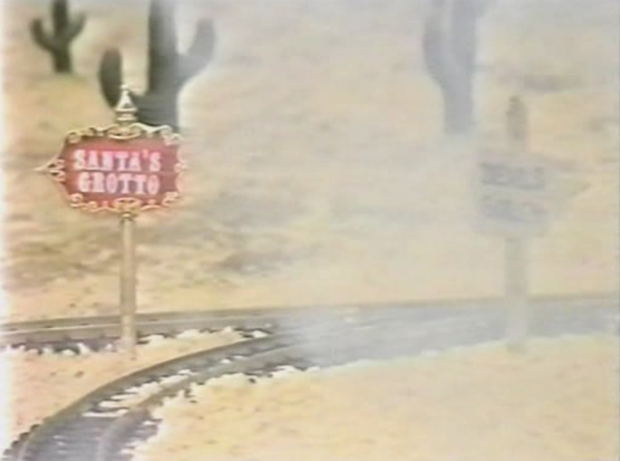 Despite his reservations about double-crossing the ‘nice kid’, Conn duly phones The Witch to confirm that he’ll usher him aboard a toy train as planned. Predictably, Quincy is as cheerfully gullible as ever when he’s promised a locomotive-based shortcut to Santa, and gleefully boards the driver’s carriage to the strains of a wah-wah-wah-wahhhhhhhh-ing version of Have Half Of My Laughter. He’s busily shovelling coal into the boiler and humming along to a chugging accelerating reprise of – you guessed it – Have Half Of My Laughter when a cackle and a flash of lightning divert the Grotto Express to ‘Devil’s Gulch’ and a hefty black train appears from nowhere speeding head-on towards his. Quincy spots it just in time for them to collide on a bridge with a spectacular display of sparkler-level pyrotechnics, and it’s into the ad break with a DA-DA-DAAAAAAAAAAAAAAAAA variation on the Thames jingle. If they didn’t sneak a Quality Street advert in there somewhere, then they really were missing a thematically appropriate trick.