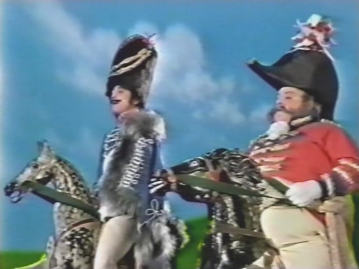 Part Two opens with a recap of the train crash, although this time we get to see that Quincy has safely rolled away onto some cheapo non-branded copyright-averting knock-off Lego. There he is discovered by a Miss Muffett-esque young lady named Rebecca, and the two seem to hit it off, strolling off hand in hand through a glaringly Chromakey-derived Not Lego vista. Rebecca wants to show him her interlocking brick-built village, and on the way they sing a song about how much they have in common, interspersed with toe-curlingly panto-style ‘romantic’ dialogue. There’s only one problem though – Rebecca has always dreamed of marrying a doll in uniform, and passive-aggressively provokes a pride-wounded Quincy into huffily acquiring some military attire from the village tailor. Inevitably, he is promptly mistaken for a real soldier and marched off to battle. Rebecca enthusiastically and admiringly shouts that he should write to her every day, and then and only then decides to sob that she liked him as he was and that she doesn’t think she will ever see him again. It would probably not be too unfair to call her a fucking idiot and ask what in the name of sanity she was actually expecting to happen.