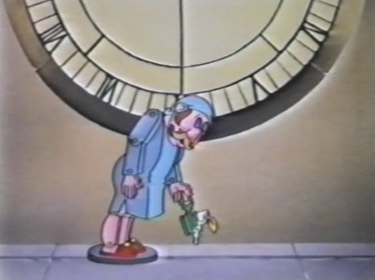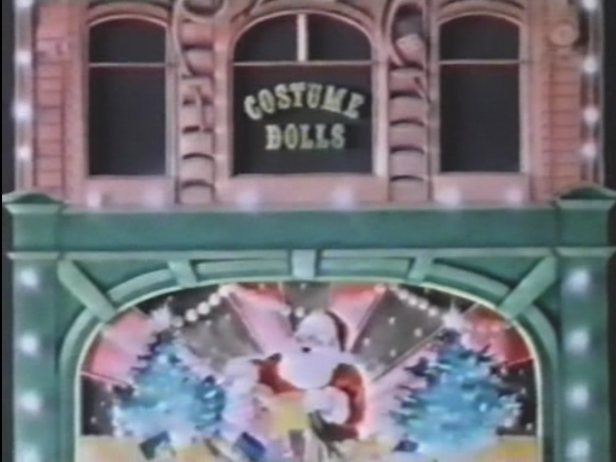 After a suitably festive peal of bells, and a title card depicting the sort of youngsters who would grow up to take every opportunity to remind you that all they got in their day was a wooden train and a tangerine and they were grateful for them too, Quincy’s Quest opens with animation of the London skyline which, while not credited as such, certainly looks as though it’s the work of regular Thames TV collaborators Cosgrove Hall. As a twinkly trail of snow spirals through the streets and bursts above the rooftops, we zoom in on a clock face chiming the hour with the aid of a clearly less than enthused ‘old man with nightcap and candle’ clockwork figure. Then it’s down the front of the building like some reverse version of The Hudsucker Proxy, past a plasterwork Humpty Dumpty, past signs promising ‘Fun Gifts’, ‘Games’, ‘Jokes & Tricks’ and ‘Costume Dolls’, and ending up focusing in on a huge Santa hoarding. Yes, it’s a department store, and if it’s not quite the night before Christmas, then it’s certainly very close to it.