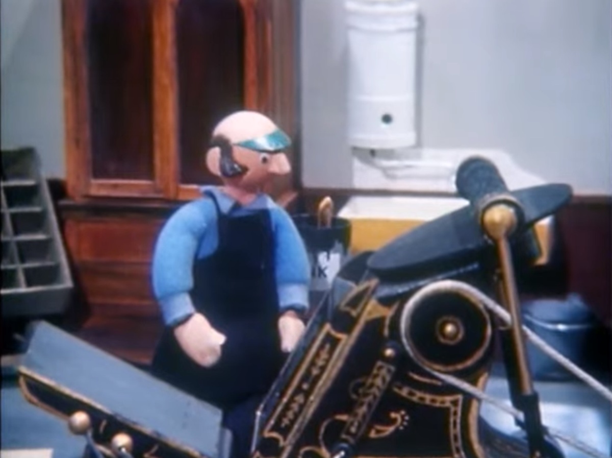 Over in his print shop, Mr. Munnings is hard at work setting up his ink and typeface – as we are told in seemingly unstoppably intricate detail over an instrumental version of his song – to knock out some branded paper bags for greengrocer Mr. Clamp; who, what with his own song exhorting all and sundry to “come buy, come buy, come buy them from me”, never seems to have missed a promotional trick. Constable Potter sticks his head round the door for no obvious reason while the bags are printing, and then promptly disappears again, which was a tad inconvenient of him as he could easily have helped avert the chain of ridiculousness that followed. As a result of Fred’s copper cabling chicanery, when Mr. Munnings telephones Mr. Clamp to inform him that the bags are ready, he gets through instead to Miss Lovelace, who is none too impressed at having her time wasted with paper bag-related blather.