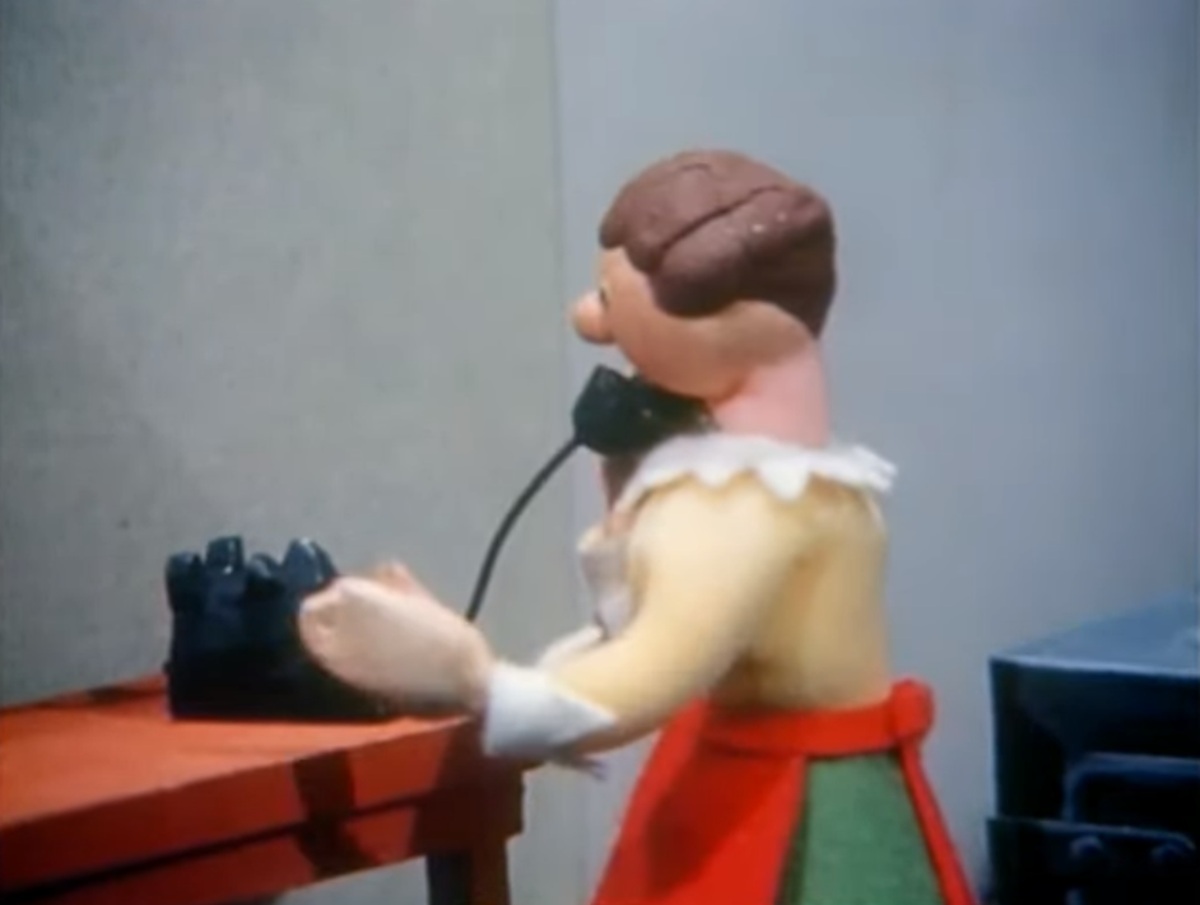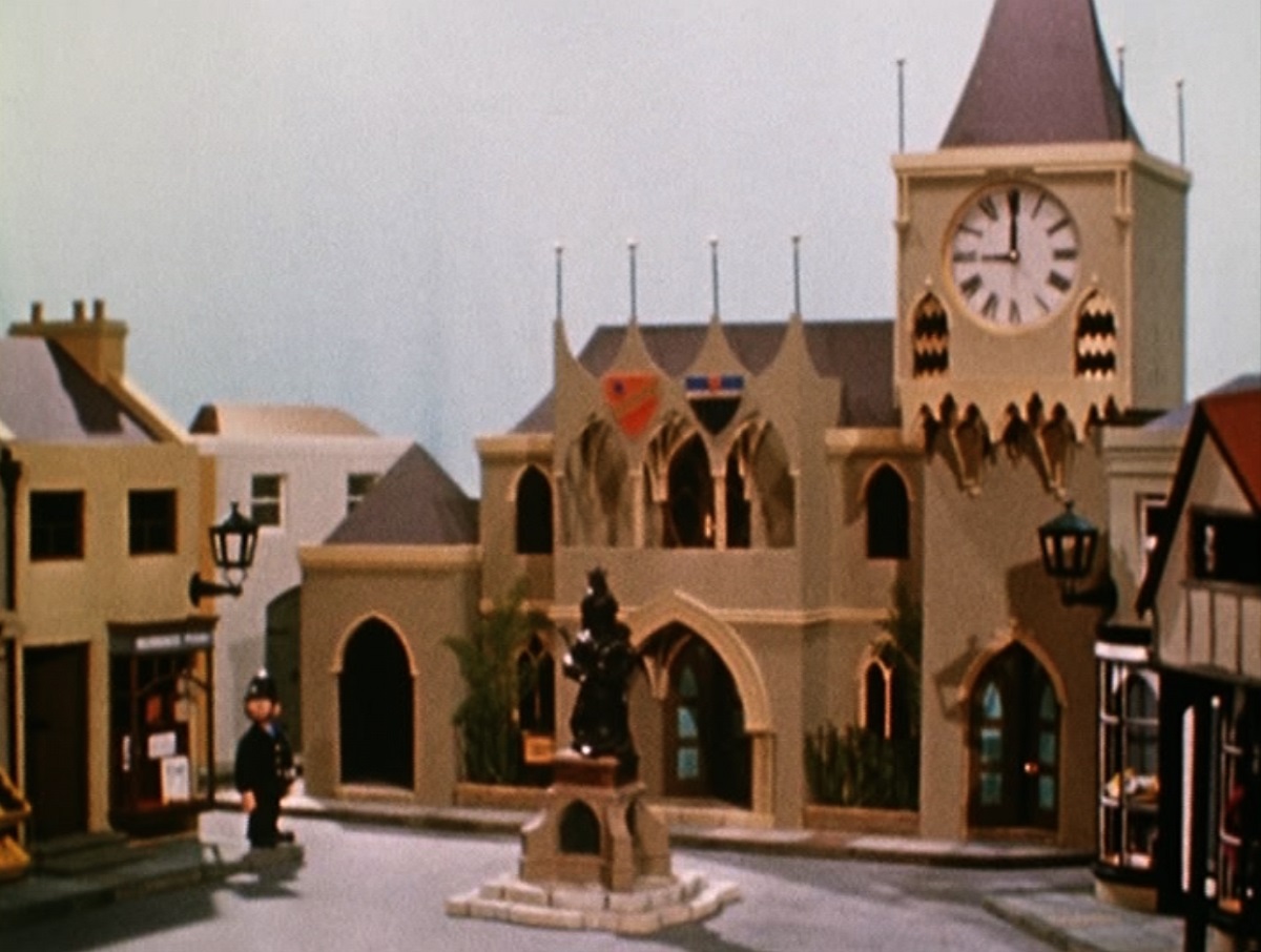 Like every episode of Trumpton, Telephone opens with the familiar sight of the programme’s name in white text on a black splodge on a deep blue background, and what appear to be the exact same first three notes as the opening theme from Camberwick Green, presumably incorporated as part of some sort of vague Clown-skewed cross-show continuity that we are probably best not questioning. There’s that celebrated unsteady zoom as Brian Cant weighs in with his familiar introduction to the clock – “steadily, sensibly, never too quickly, never too slowly, telling the time… for Trumpton!” – and the figures of town founders Sir Rufus And Lady de Trompe emerge to strike the hour and announce the start of the working day. This they do to the accompaniment of one of Freddie Phillips’ best compositions Chime And Clock Theme, which, as if to underline his precision-targeted home-made musical genius, features exactly nine chimes to tally with the clockface showing nine am. PC Potter (and not PC McGarry like you& thought) takes a look around the town square, which immediately bursts into life as a milk float cruises by and everyone opens up shops, sets up selling pitches and looks out of windows to the jerky, frantically-paced sound of Busy Little Market Town, which fades out just as the Mayor comes out onto the Town Hall balcony to get some fresh air.