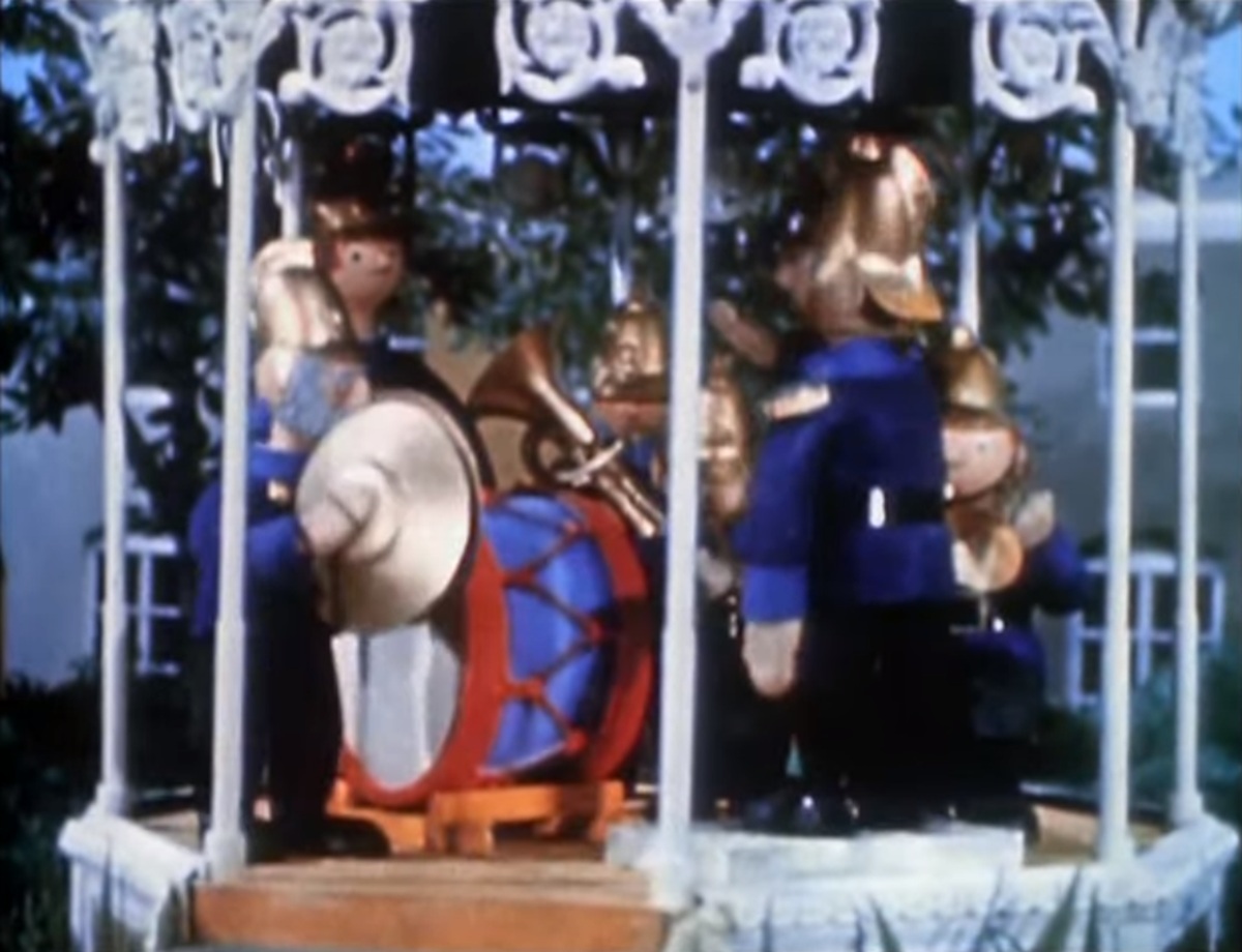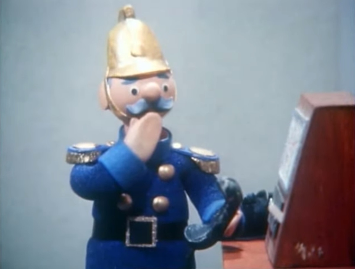 Anyway, everything is all sorted out quickly and easily enough and to everyone’s satisfaction. So much so in fact that The Mayor invites Mr. Wantage and Fred to come along to the park and enjoy the Fire Brigade’s daily band concert. Although this involves more or less the same footage as every episode of Trumpton, with the Fire Brigade bashing out their boisterous waltz on brass instruments that sound suspiciously like a double-tracked acoustic guitar, while the locals and a disconcerting influx of Camberwick Green puppets look on, we do get an additional cutaway shot showing Mr. Wantage and Fred arriving to lend an ear. Then it’s back to Chime And Clock Theme, and more of those splodges carrying credits that seemed so mysterious and evocative to younger viewers (of which, it should be said, a significant number for the time are for female contributors), before fading out with not a single terrifying Clown in sight.