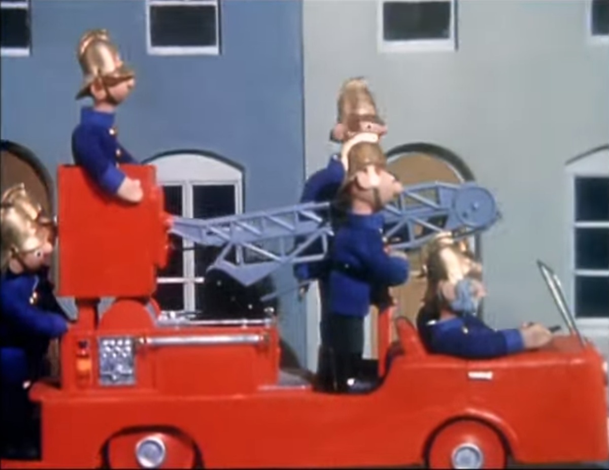As anyone of a certain age will be able to recall with alarming clarity and detail, the impressively heavy-looking Fire Station doors clang open, Pugh, Pugh, Barney McGrew, Cuthbert, Dibble and Grubb slide down the pole and line up next to the engine, Captain Flack blows his whistle and conducts a quick inspection and they’re off and away through the streets of Trumpton to the strains of the jaunty Firemen Bold, which you can’t help but notice bears more than a passing resemblance to a certain Buffalo Springfield number. On arriving Chez Minton, they are surprised to be greeted by a placid Dora and a distinct lack of smoke. Chippy and Nibs promptly turn up, and calmly theorise that there must have been some kind of mixup with the GPO engineers, before dismissing all of this nonsense and heading indoors in search of their not yet burned dinner, in a tone that suggests an implied impatient “woman!” at the end. “Poor Captain Flack”, muses Brian Cant as the picture momentarily fades to black, “he never has a proper fire to put out”. No, but he gets all manner of other and probably more interesting stuff to do. AND makes Cuthbert fall in a pond.