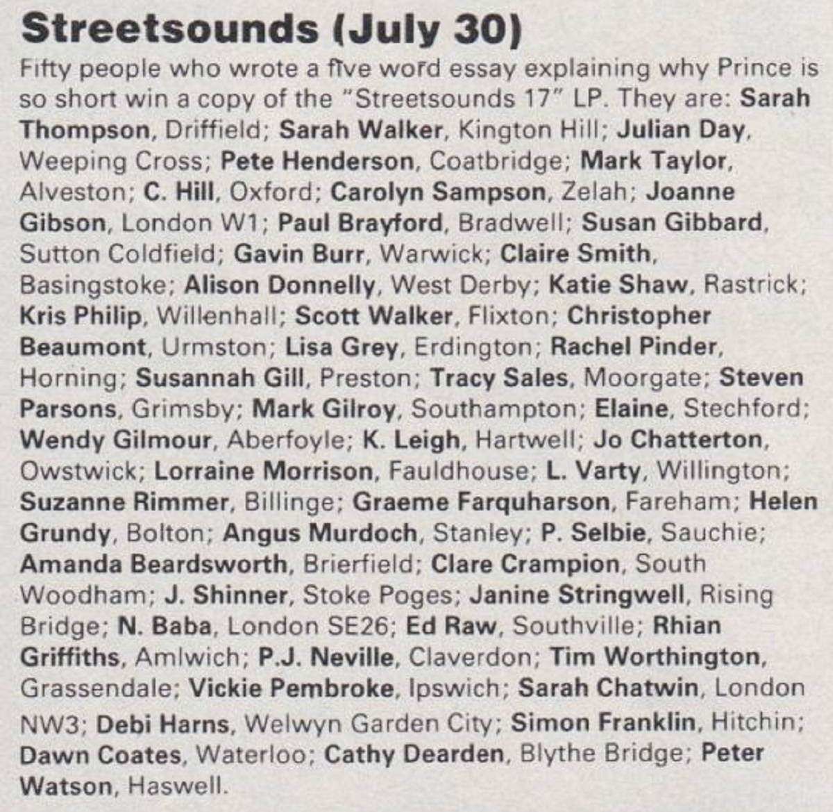 In order to win a copy, you were challenged to explain, in an essay lasting no longer than five words, why Prince was so short. “The effects of Purple Rain“ was my aaaaahhh-tastic pseudo-satirical response, which clearly amused Sylvia Patterson and company sufficiently for them to send me one of the fifty copies on offer. It arrived before the issue with the list of winners came out, in fact, and once it did hit the ‘newsstands’ I became something of a minor celebrity in school for a week or so. We had to make our own ‘trending’ in those days.