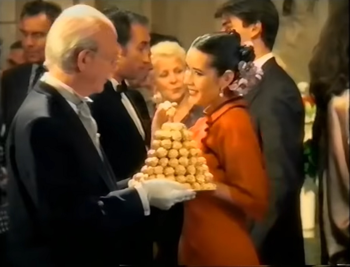If there is one commercial that both looks and sounds and in all honesty probably even smells like the absolute definitive representation of the seventies’ deluded vision of profligate glamour in an austere world somehow staggering on into the eighties – a baffling juxtaposition tantamount to The Delfonics and Skiboy being turned away from Stringfellows for being too ‘jet set’ – then it has to be that Ferrero Rocher one with The Ambassador’s Reception.