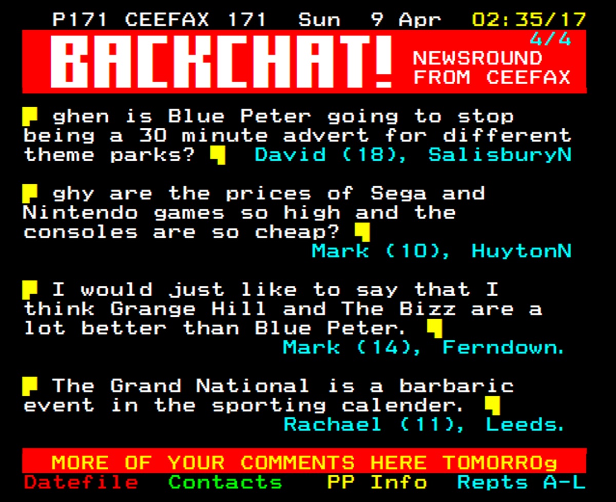 Backchat didn’t put in an appearance on the last day of Ceefax, but you can read more about what did in Hang On A Minute Lads, I’ve Got A Great Idea… here.