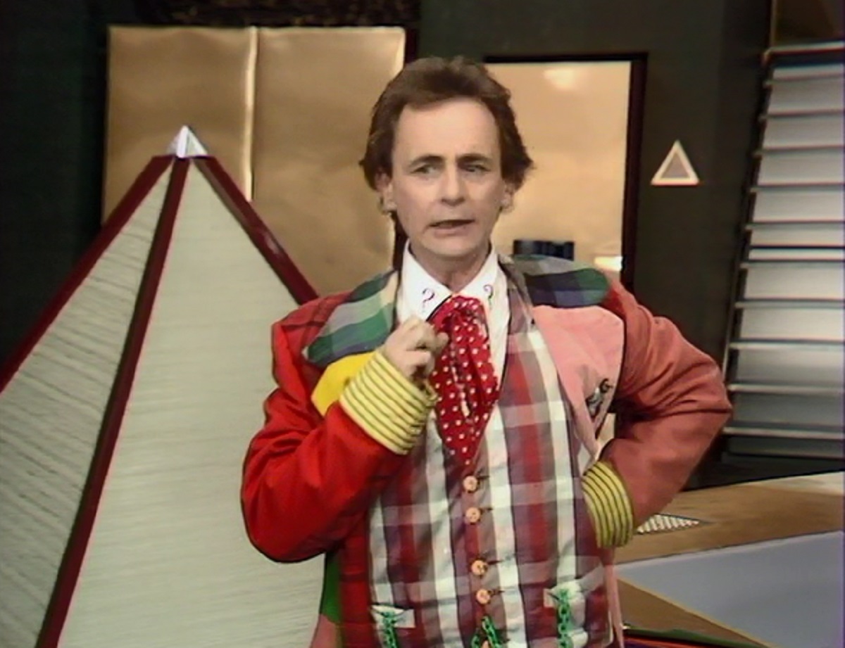 Meanwhile, if we’re owning up to all of the less-than-good bits in Episode One of Time And The Rani, then we may as well come clean about that wince-inducingly unfunny scene with The Doctor picking out his new costume. By this time it was apparently a ‘tradition’ for the incoming Doctor’s first episode to feature a scene set in the Tardis Wardrobe Room – after all, it had happened a staggering total of once before then* – and, so the story goes, when John Nathan Turner noticed that Pip and Jane had neglected to include one, he hastily scribbled one in himself – and good lord, can you tell. Thus it was that we got to enjoy Sylvester McCoy wandering around making weak puns about sweaters whilst Keff McCulloch indulged in a preposterous medley of musical motifs; a burst of accordion for some Napoleon-styled getup, a fanfare for a busby, school bells playing a flat approximation of the Big Ben chimes for a mortar board, some of Tom Baker’s outfit accompanied by a bit of that xylophone that was always in every single scene of all of his stories, frilly-shirted Pertwee-esque harpsichord jangling, a comedy smashing window for the full Peter Davison ensemble, and finally a quick flourish of banjo as he steps out with a Troughtonesque coat, his new Bud Flanagan-inflected costume, and that bloody Question Mark Jumper, which surely nobody can ever have thought was a good idea. Even the fans who bought and wore their own. Incidentally, keep an ear out for that banjo, as you’ll be hearing a lot more of it. More than you would ever conceivably want to, in fact.