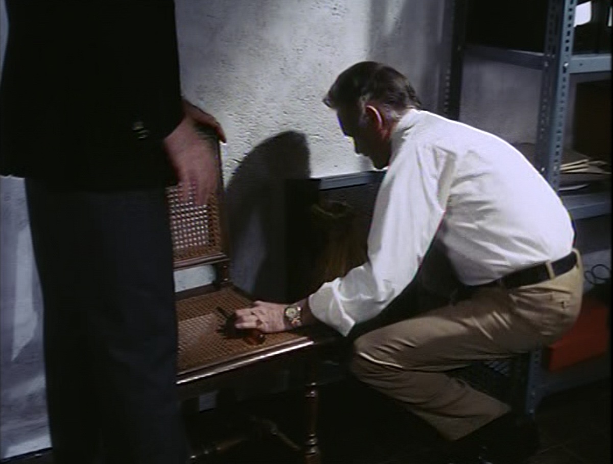 Thankfully, there is a little more in the way of cross-character chat once The Tiger returns to the gang’s headquarters with the gold, explaining to The Fox’s consternation that he got out of there without cleaning up behind him due to the denims apparently seeming untrustworthy even for henchmen ferrying smuggled gold under armed guard, intending to return and remove his prints once the coast was clear. After another lengthy and largely wordless scene in which they stow the gold behind a false wall behind a false chair, he takes an equally lengthy drive back to the scene of the not quite crime only to find that the denims are now slumped assassinated on the sofa. This, bafflingly, is then followed by some protracted over-the-phone exposition explaining that he had gone back to clean up and then found them murdered, presumably for the benefit of any viewers who had been deliberately refusing to pay attention, and he promptly leaves only to find himself followed by the police and arrested after what could scarcely be described as a car chase.