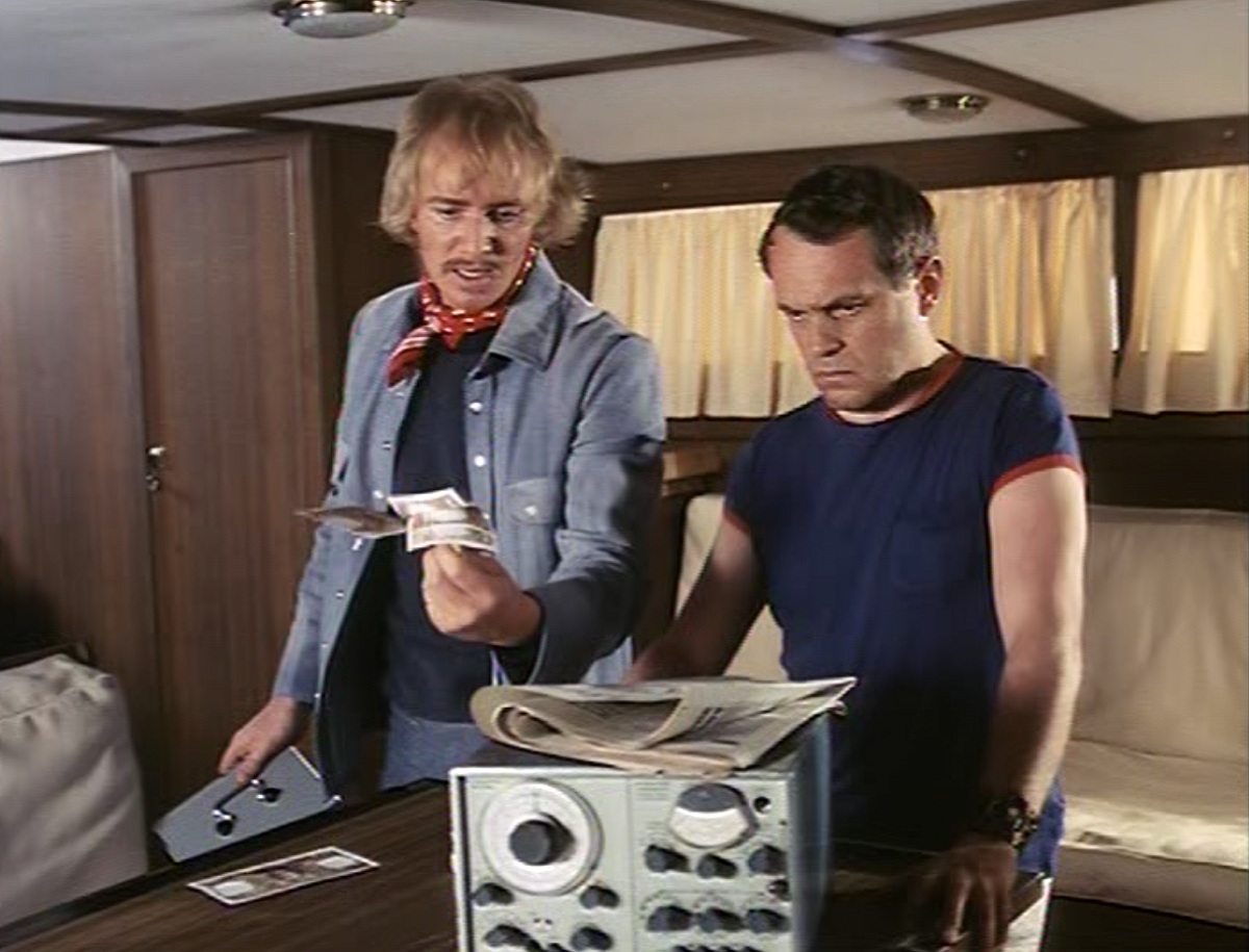 Opening with some smugglers on a yacht helpfully advising a diver to “be careful – that’s gold, not lead!”, The Counterfeit Trap has the dubious distinction of being built around a plot that comes across as a good deal more straightforward and simplistic than it actually is. Having been handed over to the sound of some cheap and nasty funk verging on a twanging spring to two seventies as it gets Denim Men – albeit in the sense of looking like a denim-festooned member of one of those sickly soft-rock bands that have you musing that it’s no wonder punk happened when they turn up on the Top Of The Pops repeats rather than the manly torso bloke flogging Denim aftershave by being caressed by a female hand to the sound of a Bill Mitchell voiceover and some epically scuzzy guitar – the non-leaden gold is being driven to a rendezvous point while The Elephant – John Mills – is intently watching another building altogether through a telescope. This is where some money forgers are plying their literally lucrative trade, and The Tiger and The Fox – Barry Morse and Brian Keith – are getting into position under the guise of television aerial repairmen while The Leopard – Lilli Palmer – attaches a small incendiary device to the forgers’ car and makes an anonymous call to the police. As they dash outside to check on their mildly smouldering motor, The Tiger and The Fox drop in through the skylight and abscond with the photocopied millions, with the four of them making their escape and whistling aimlessly in the aerial repairman’s van while the coppers show up and catch the franc-fakers burnt ochre-handed. As entertaining as all this may be, you cannot help but notice that it has been eight minutes without any sign of anything in the way of meaningful dialogue.