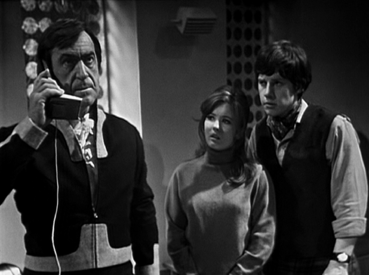 Also paying close attention to certain aspects of Victoria’s wardrobe, if the first episode of The Ice Warriors is anything to go by, was her travelling companion Jamie McCrimmon. In a textbook ‘nice intention, shame about the execution’ move for Doctor Who at the time, not to mention somewhat impractically for a research station in the middle of an icy tundra, Miss Garrett and her fellow climate-saving clever-clogs female technicians are given to walking around Brittanicus Base in Mary Quant-style two-tone minidresses of such alarming brevity that they would have finished higher than their underwear had they actually been wearing any, which a slightly racier than conventional strand of logic dictates that they can’t have. Needless to say, Jamie has observed this and is not exactly upset about the matter. Presumably speaking for ‘The Dads’ everywhere, he adopts a louche, relaxed pose on a sort of bendy ‘futuristic’ couch thing and asks Victoria if she had noticed what ‘those lassies’ were wearing. Apparently having temporarily forgotten her own predilection for dramatically short skirts, Victoria replies that yes she had, and she thinks they should have more self-respect, and shame on Jamie for taking such an active interest in the subject. Unfazed by this, Jamie breezily asks if Victoria sees herself wearing anything similar, which invites an even more stern rebuke and an announcement that she will now change the subject, which is promptly done for her in an appalling display of Ice Warriorsplaining when Varga chooses that exact moment to lumber out from behind a curtain. There’s probably an interesting thesis to be written looking at how despite its cake-and-eat-it general failure to ‘do’ feminism from a modern perspective, this and other examples from sixties Doctor Who were actually quite striking and daring in their actual context and it’s a shame that they have since been overshadowed by later less enlightened tangents, but the real pressing question is who decided Jamie should be offering his views on fashion and design and indeed why. Was his week-in-week-out uniform of shapeless jumper and kilt masking a secret obsession with the tripped-out stylings of I Was Lord Kitchener’s Valet and Granny Takes A Trip? Was he frequently invited onto A Whole Scene Going to talk about shift dresses and the plastic raincoat revolution? Did he indeed flit from shop to shop just like a butterfly? Sadly, we may never know, though there are some vagaries of mid-sixties fashion we can be somewhat more certain of…