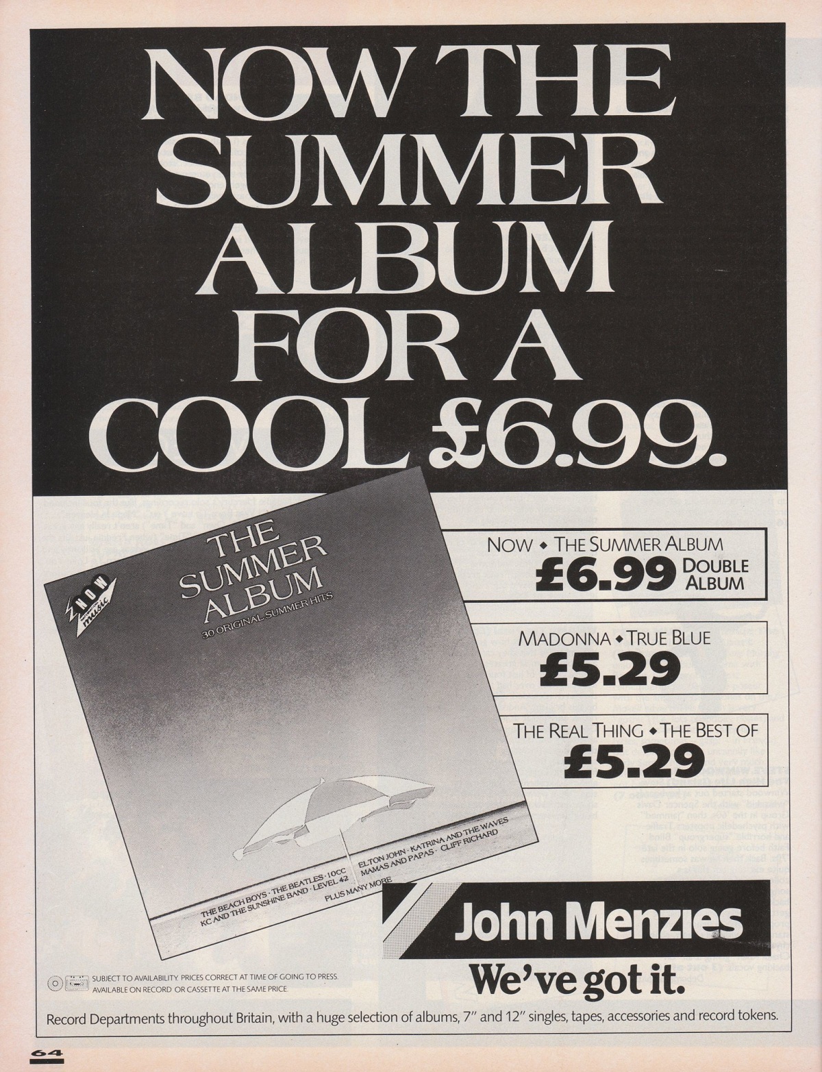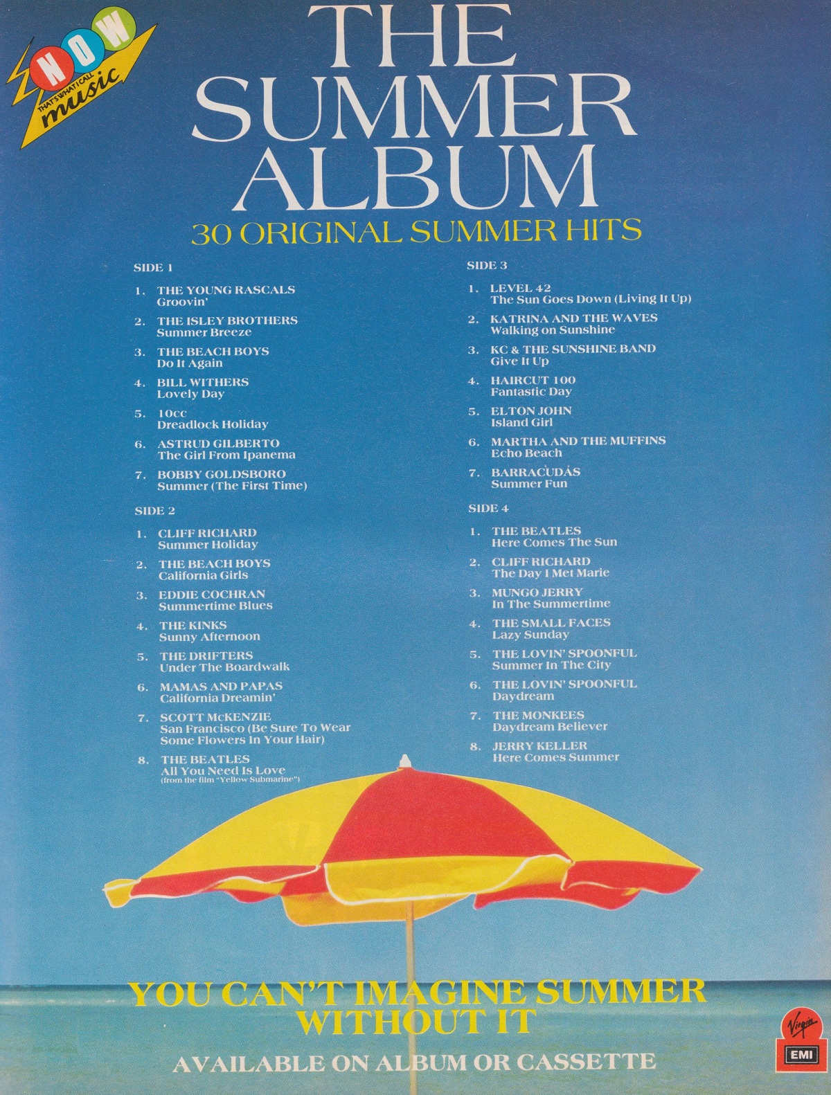 Released in June 1986 in the full expectation that it would prove every inch a commercial high tide as Now – The Christmas Album had done six months previously – it didn’t – Now – The Summer Album was a bizarre attempt at evoking the sound of about fifteen different idealised visions of ‘summertime’ all at once, which not only veered all over the place stylistically and chronologically but also found that there weren’t enough licensable ‘summer’ songs to fill up a double album and had to resort to including a handful that were quantifiably about the autumn or in one or two cases not specifically aligned to any season whatsoever. It is the only Now That’s What I Call Music! album ever to feature any track by The Beatles, along with a substantial number of esoteric and at the time half-forgotten at best names and, for reasons nobody has ever been able to satisfactorily explain, two tracks by The Lovin’ Spoonful right next to each other. It can never quite make its mind up whether it is trying to reflect a Nescafe Frappe advert-adjacent vision of sophisticated jetting off to exotic climes to sip fruit-crammed cocktails on a beachfront lounger at sundown, tinnily tannoy-accompanied throwing up after getting off those things that spun round within things that spun round at the fairground, distractedly ‘fishing’ with a plastic net at a coastal resort to take your mind off the fact that your ice cream fell straight into the sand the second you tried to take a lick of it, or hosting extremely late evening barbecues soundtracked by a skipping CD of Summer Chart Party after ‘forgetting’ to invite your neighbours. It’s got everything from rock’n’roll era salutes to the basic concept of ‘summer’ to stroppy post-punk seaside alienation, geographically contradictory pointers towards where you might find the ‘Summer Of Love’, wistful yet radio-troublingly lyrically frank wistful reminiscences of ‘getting’ it ‘on’ in the sunshine, and an Elton John song that even Elton John didn’t realise existed.