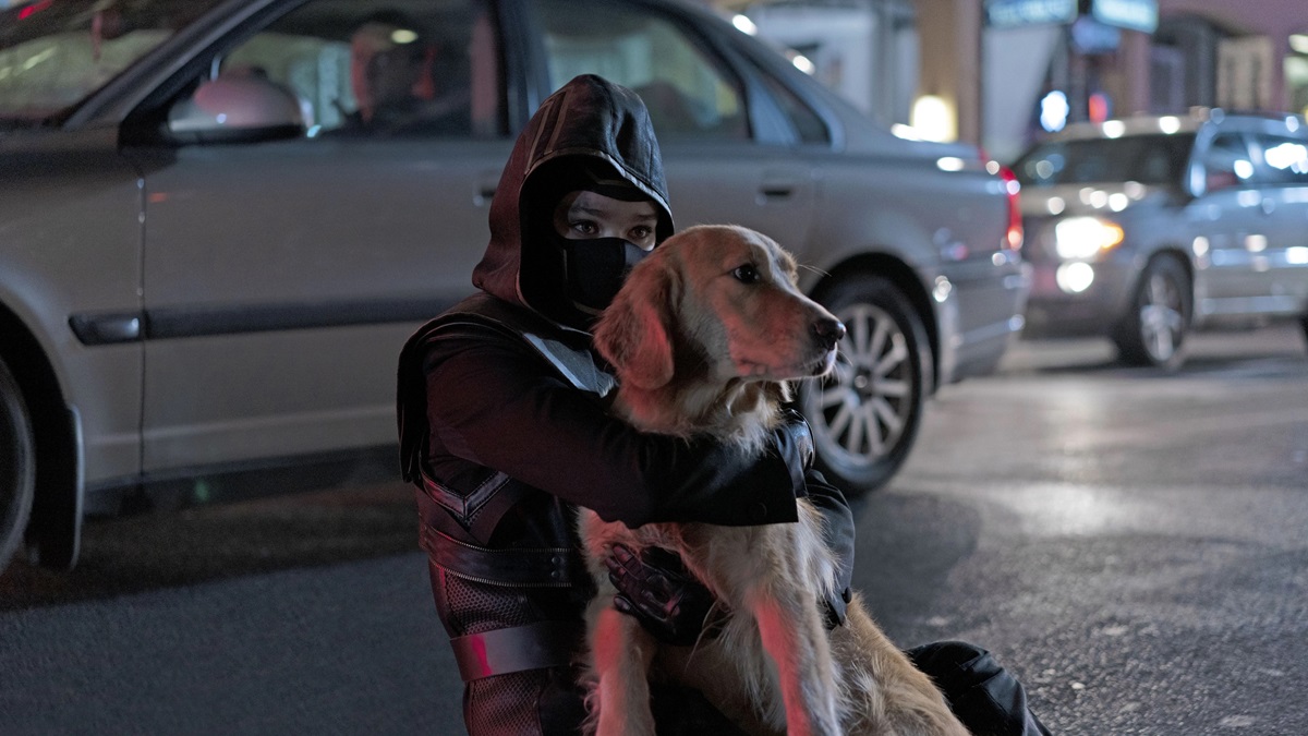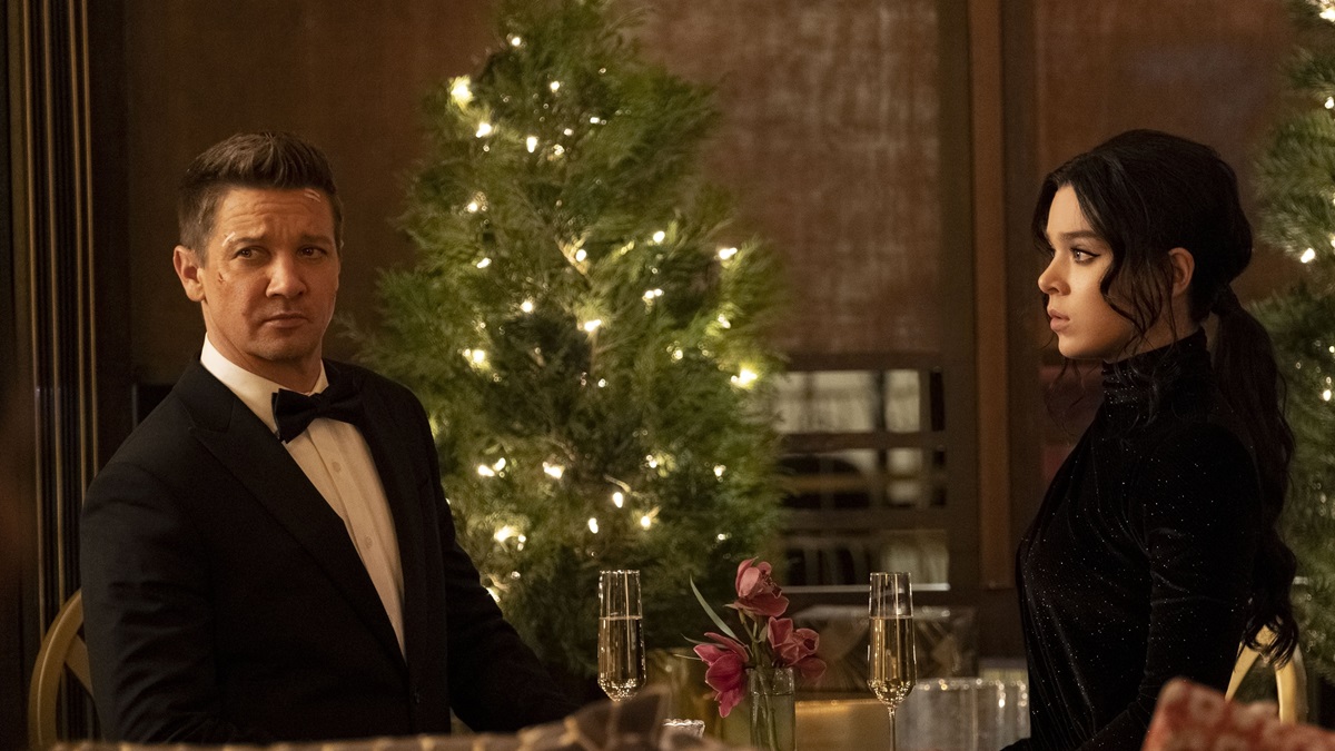 Even aside from the full-tilt snow-dusted skating outside Rockefeller Centre razzle dazzle of Christmas in New York, what is striking about Hawkeye from the outset is just how much character they have finally afforded to Clint Barton, and in a realistically downbeat sense at that. We join him in the process of adjusting to his explosion-related hearing loss, still affected by the enormity of recent events and his personal failure in the face of overwhelming success, and feeling alienated and rejected and unwanted by the public and even by his former fellow Avengers. He is, at long last, treated as an ordinary man with extraordinary talents – not abilities – who found himself caught up in events that were beyond his control but which often only he had the nerve to confront head on. Nowhere does this find sharper relief than in the contrast between a restaurant owner insisting on paying for his family’s meal and the graffiti in the bathroom declaring ‘THANOS WAS RIGHT’; the fact that some people actually did well out of The Snap and violently resented having to go back to their second class status was addressed effectively in The Falcon And The Winter Soldier which you can hear more about here, and the equally difficult fact that some are just credulous conspiracy theory-toting hopeless cases would be further addressed in Spider-Man: No Way Home which again you can find more about here. As if to add insult to injury, his primary reason for being in New York is to attend the premiere of Rogers: The Musical, an actually hilariously done all-singing all-dancing retelling of the Captain America story featuring a recreation of the events of Avengers Assemble with a fictionalised version of himself lining up alongside characters who hadn’t even been involved and presented in a manner that suggests he’s been included by sufferance rather than any determination to express gratitude for his efforts. His quiet despair on seeing the actor playing Natasha is very effectively rendered, and is poignantly tempered by a small girl in the audience waving to him and his own daughter’s recognition of his emotional plight. Indeed, the most welcome surprise in Hawkeye is that his family, relegated to short appearances, actually prove to be well used and more than tolerable this time around. By way of contrast, Hailee Steinfeld gives Kate a highly relatable sense of knowing she is considerably more intelligent and capable than the society folk she is supposed to regard as her ‘betters’, yet she is roundly treated as a silly and unrealistic girl who needs to hurry on up and get married. Her resourceful subterfugal infiltration of the auction is as hilarious as it is nail-biting and although the two of them do not meet until the closing moments, they are both thrown straight into the central mystery and there is surprisingly little in the way of scene-setting beyond what is strictly necessary. Everything else is explained and clarified courtesy of reactions and character moments and the dynamic between the two is set up brilliantly by Kate, unaware of Clint’s plan to silently acquire and destroy the Ronin suit, just casually slipping it on to facilitate her escape – which despite its more serious implications, even he cannot deny she achieved extremely effectively. Although they still haven’t managed to recover that wristwatch. Or to get that dog any pizza…