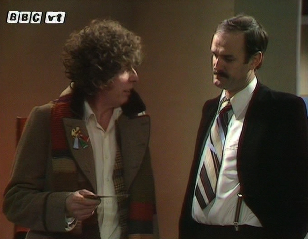 Although it is pretty much a certainty that any attempt to explain the existence of BBC Christmas Tapes in a manner that any passing casual observer with little detailed interest in the matter above and beyond the level that you would understandably expect any sane and rational member of society to have will inevitably lead to vehement denunciation in an Archive TV Forum thread by a half dozen unaccountably exercised men tutting about you not understanding the internal politics that informed the assembly of the tapes and castigating you for not mentioning BBC Head Of Having Two Different Cutlery Sets In The Canteen Charles McHaltenwood whilst vigorously confirming that they saw Storyline: Mr. Egbert Nosh and wrote the name of it down in a Silvine exercise book and also pouring scorn on your sentence construction and punctuation despite the fact that their contributions will invariably be twice the length of this and somehow contrive to feature a negative amount of punctuation marks, but that’s precisely what we’re going to be doing here and yah boo sucks to frankmarker773. In short, the BBC’s VT engineers had a tradition possibly stretching as far back as the late fifties of covertly retaining any amusing mishaps or slip-ups from studio recording sessions and live broadcasts and editing them together for their festive bash into a sort of clandestine comedy clip show where you were more likely to see Miriam Margolyes telling an Assistant Floor Manager to fuck off than you were whichever Two Ronnie it was asking for andles for fourcs. Word soon began to spread about this illicit opportunity to chortle at your colleagues’ on-camera embarrassment, and pretty much every programme from Wildtrack to The Pallisers began to throw in their own cheeky winks to the ‘backroom boys’, with some big name stars even taking a trip down to the edit suite to record their own decidedly non-family friendly linking material. There is always someone who wants to spoil the fun, however, and the 1978 effort White Powder Christmas – which, in addition to The Goodies not being able to play a gramophone record on cue, a contestant on The Generation Game losing a battle with her neckline, The Three Degrees knocking over a microphone stand, Parky moaning at studio staff for not being ‘professional’, countless Blake’s 7 props collapsing, Fred Harris booting the uncooperative Play School toys across the studio and, regrettably, some bad dangers being bad dangers, also included a Princess Anne ‘shocker’ that wasn’t in the form of a horse-riding interview re-edited into mild innuendo – fell into the hands of the Sunday People with inevitable risible front page outrage ensuing. Legends are told of some very stern words being issued from ‘on high’, and even more intriguing legends are also told of the VT Department being hurriedly cleared of all manner of covertly retained tapes including unauthorised dubs of otherwise officially wiped programming from Not Only… But Also… to The Madhouse On Castle Street where nobody now knows where half of it ended up, but whatever actually went on there was nonetheless another Christmas Tape in 1979 and probably to the surprise of nobody whatsoever it heavily featured two of the BBC’s most popular shows of the year. The second series of Fawlty Towers had made its Waldorf Salad-ignorant sausages-excepting debut in February, and Good King Memorex is suitably awash with John Cleese and Prunella Scales reacting in character to unexpected studio slip-ups to a cacophonous wash of audience hysteria, especially when Cleese responds to a shaking set wall by immediately ‘tapping’ it with a ‘how much is this going to cost me?’ look on his face. Similarly Doctor Who – which the Sunday People had somehow failed to notice was also well represented in White Powder Christmas complete with Mary Tamm doing mock ‘horny on main’ and Tom Baker telling K9 that “you never know the fucking answer when it’s important, do you?” – crops up throughout, with noted witticisms including a Dalek saying ‘bollocks’ to Michael Aspel. As if all of that wasn’t enough, both shows also team up for maximum 1979 BBC-ness courtesy of the studio session for John Cleese’s cameo in City Of Death, which resulted in a series of improvised comic sketches between Tom Baker and what is essentially Basil Fawlty in all but name and arguably cut of suit, including one grimly hilarious exchange about an autograph that is not going to be recounted here, less out of fear of ‘cancellation’ than that a load of tedious sodding bores might start dribbling on about how you can’t make jokes about that now in private recordings that the public were never supposed to see because ‘woke’. Still, not all of Tom Baker’s coarse asides escaped the viewing public completely…